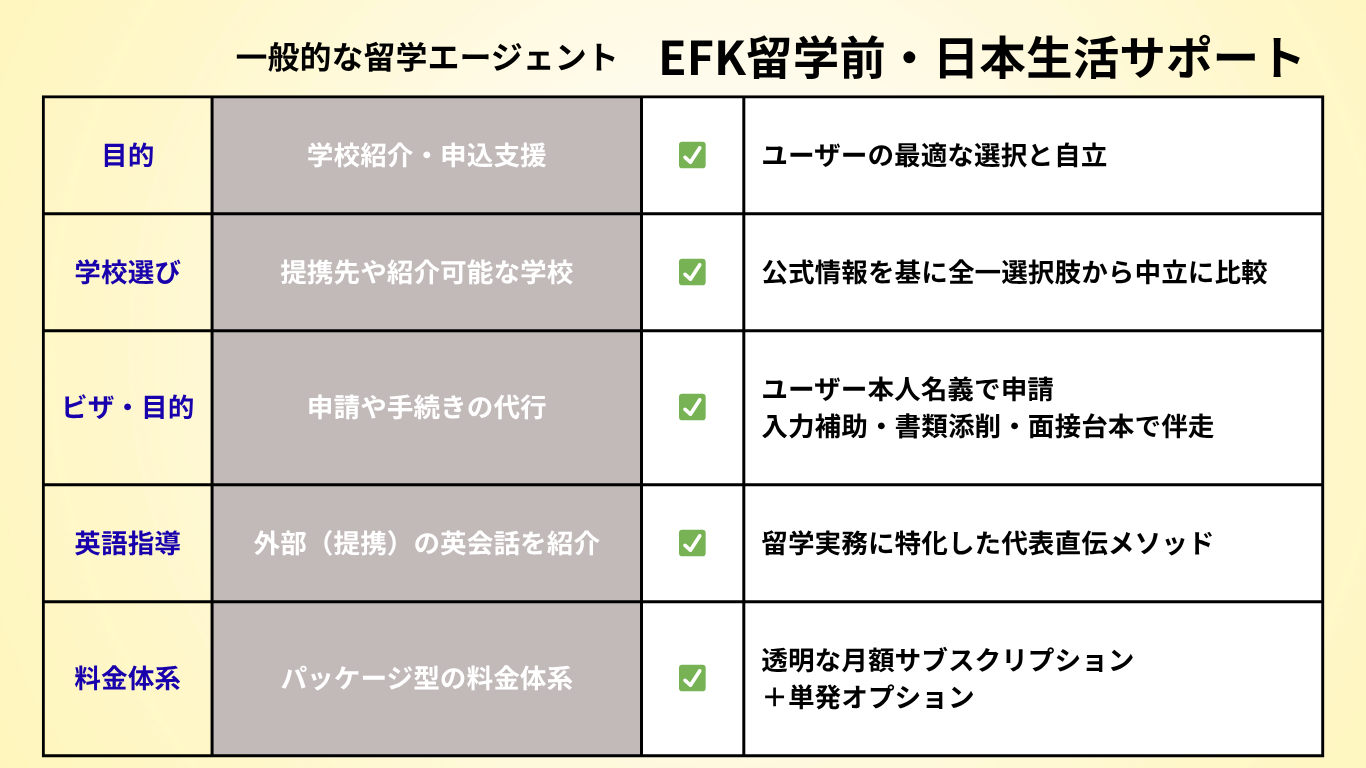 だからこそ、EFKは一般的な留学エージェントとは役割が異なります。