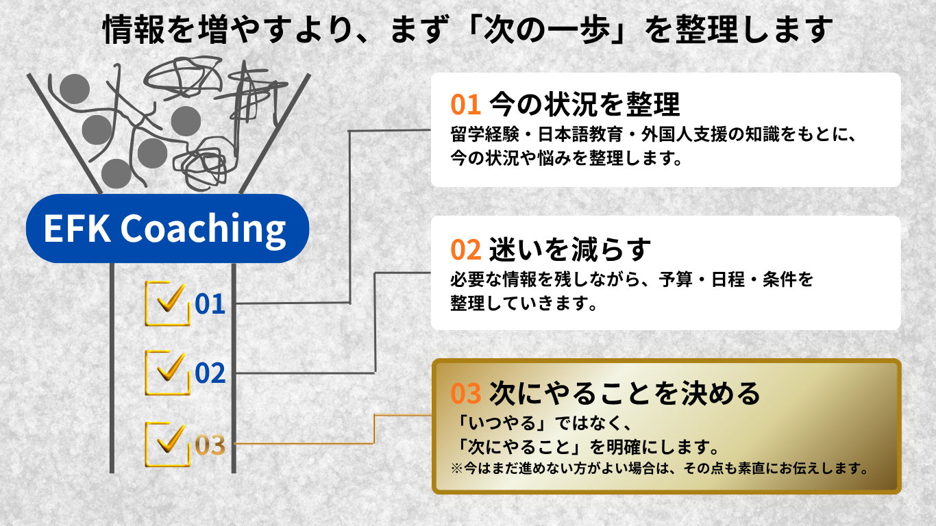 - 留学スタート整理パック(60分):60分で「次の7日でやること」を3つに絞ります